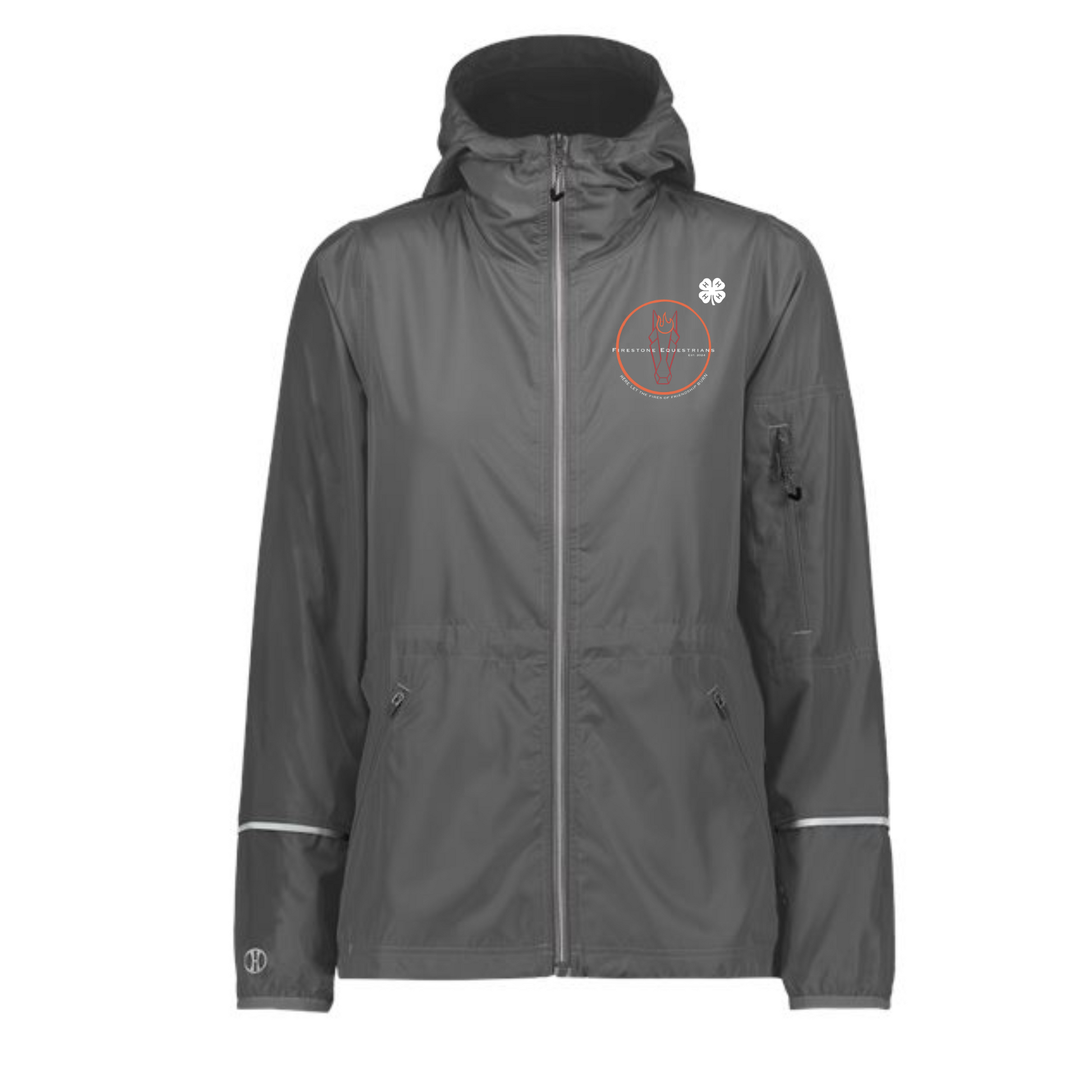This listing is for a Firestone Women's packable hooded Holloway jacket! The nice thing about this jacket is that it is wind and water resistant, has an adjustable hood with concealed cord locks, spandex cuffs, front zippered pockets and another on the left sleeve! Best yet it features reflective trim and all packs into the utility pocket on the left sleeve. This listing features the club logo on the front left side of the jacket. Please look closely at the logo with each jacket color when making your selection.